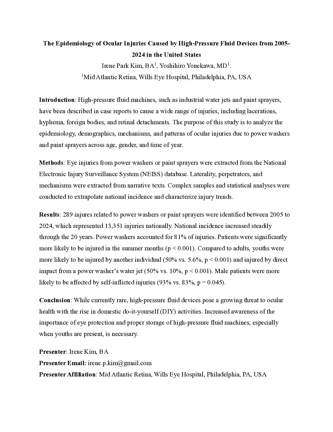 The Epidemiology of Ocular Injuries Caused by High-Pressure Fluid Devices from 2005-2024 in the United States