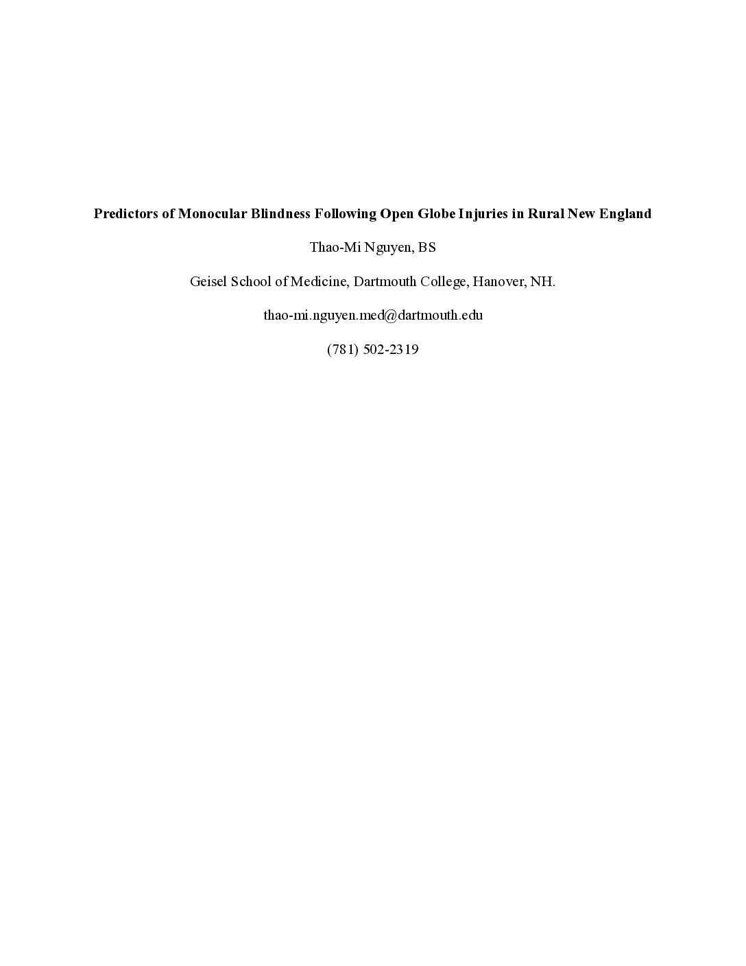 Predictors of Monocular Blindness Following Open Globe Injuries in Rural New England