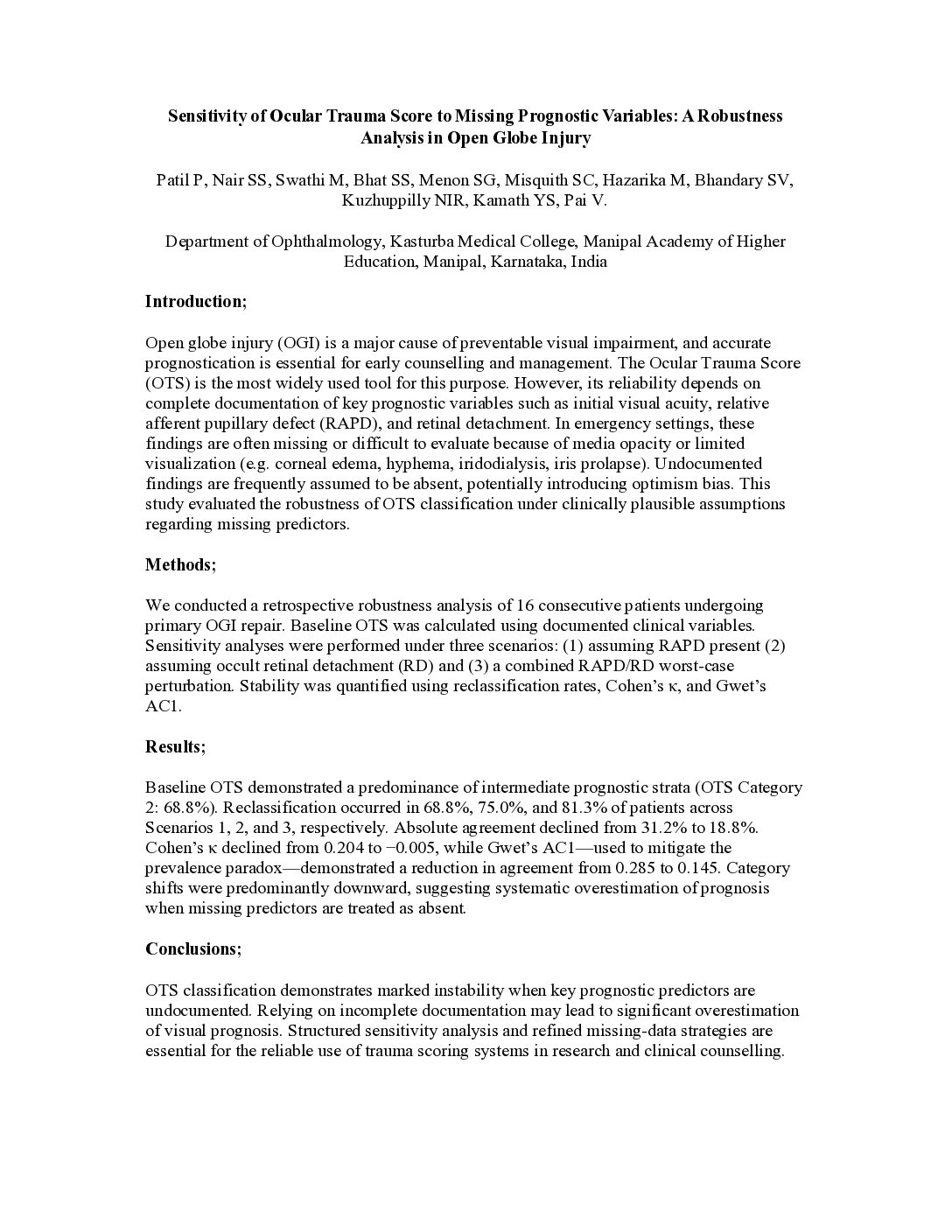 Sensitivity of Ocular Trauma Score to Missing Prognostic Variables: A Robustness Analysis in Open Globe Injury